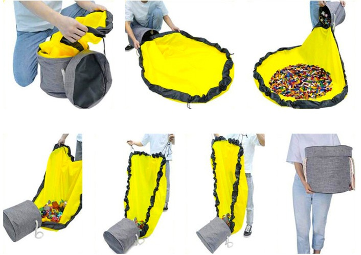 BASKET WITH MAT FOR TOYS 2 in 1 – the product fulfills two functions. This is a brilliant solution for storing and quickly tidying up blocks and toys . The mat is also used for playing. It is large, with a diameter of 135 cm. This makes it much easier to pour out and collect toys. Additionally, the mat has a sewn-in string with a stopper, which, when pulled, turns it into a bag. USEFUL BASKET HANDLES AND HIGH MAT EDGE - the basket is equipped with handles, thanks to which you can easily transport the container. They are made of massive and thick string. Additionally, the mat has raised edges, which prevents toys or other elements from falling out of the mat. MULTIFUNCTIONAL - perfect for toys such as blocks, dolls, toy cars and more. It can also be used for outdoor picnics, camping, beach and more. Its versatile use will make it accompany you for a long time.. WATERPROOF MATERIAL - the set is made of high-quality Oxford fabric and polyester. It is therefore wear-resistant, odorless, environmentally friendly, waterproof inside and out. From now on, you don't have to worry about moisture in your stored toys. SPECIFICATION - material: outer cover: oxford fabric, inner cover: PVC, others: cotton + iron + PP) with mat (oxford fabric); basket colour: grey; mat colour: yellow/black; basket dimensions: diameter: 31 cm; height: 27 cm; basket capacity: 20l; mat diameter: 135 cm; diameter with mat edge: 150 cm; edge height: 6.5 cm; weight: 507g; weight in packaging: 508g.